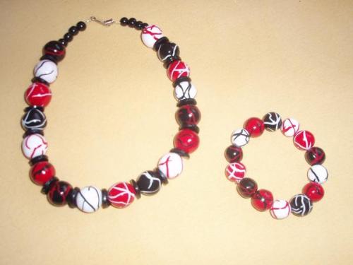 Ja die schwarz-weiß-rote Kette und das Armband sind auch selbst gemacht. Das Perlen-Gestalten mit FIMO ist wirklich kinderleicht, wenn man sich ein bisschen eingearbeitet hat. Du formst einfach Kügelchen und in dem obigen Fall hab ich dann aus einer anderen Farbe FIMO ganz dünne Fäden gewalzt und diese dann auf die Kügelchen gedrückt und die Kugel zum Abschluss noch einmal geformt, damit man die Übergänge nicht so sehr sieht.